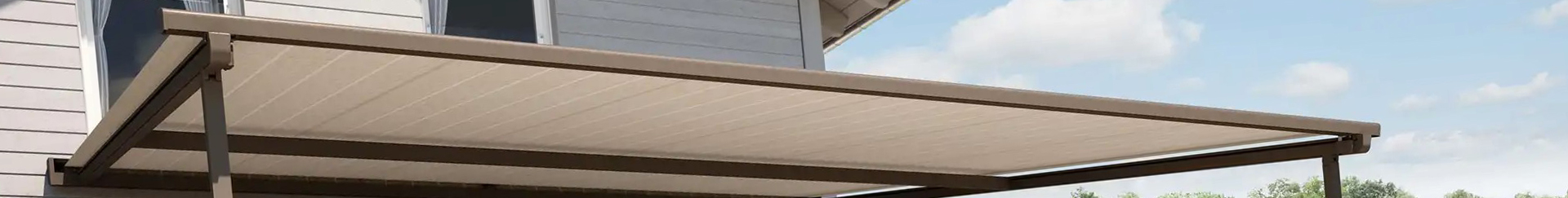Toldo cofre pérgola con estructura delantera de 60x60. Guías de pistón a gas retranqueadas.