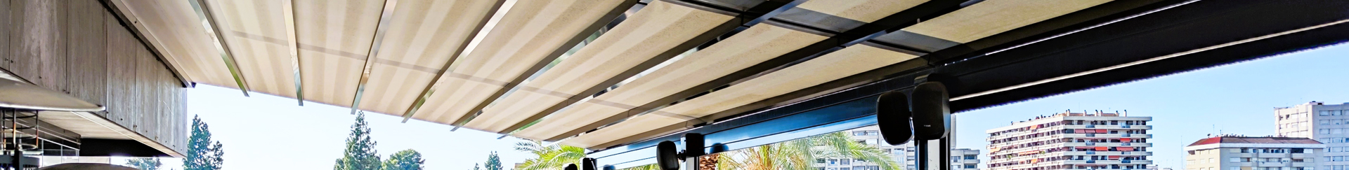 Sistema TENXO entre paredes con lona tensada motorizada, tracción de correa dentada BRECO oculta en guía.
